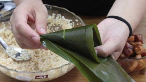 4. 封口:将粽叶的另一端覆盖过来,用手指压实,确保糯米和馅料不会漏出来。